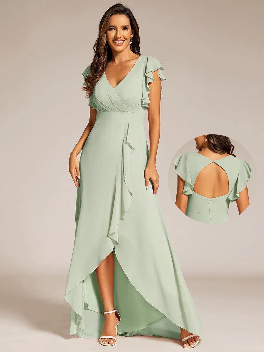 Robe de demoiselle d'honneur en mousseline à col en V et ourlet asymétrique