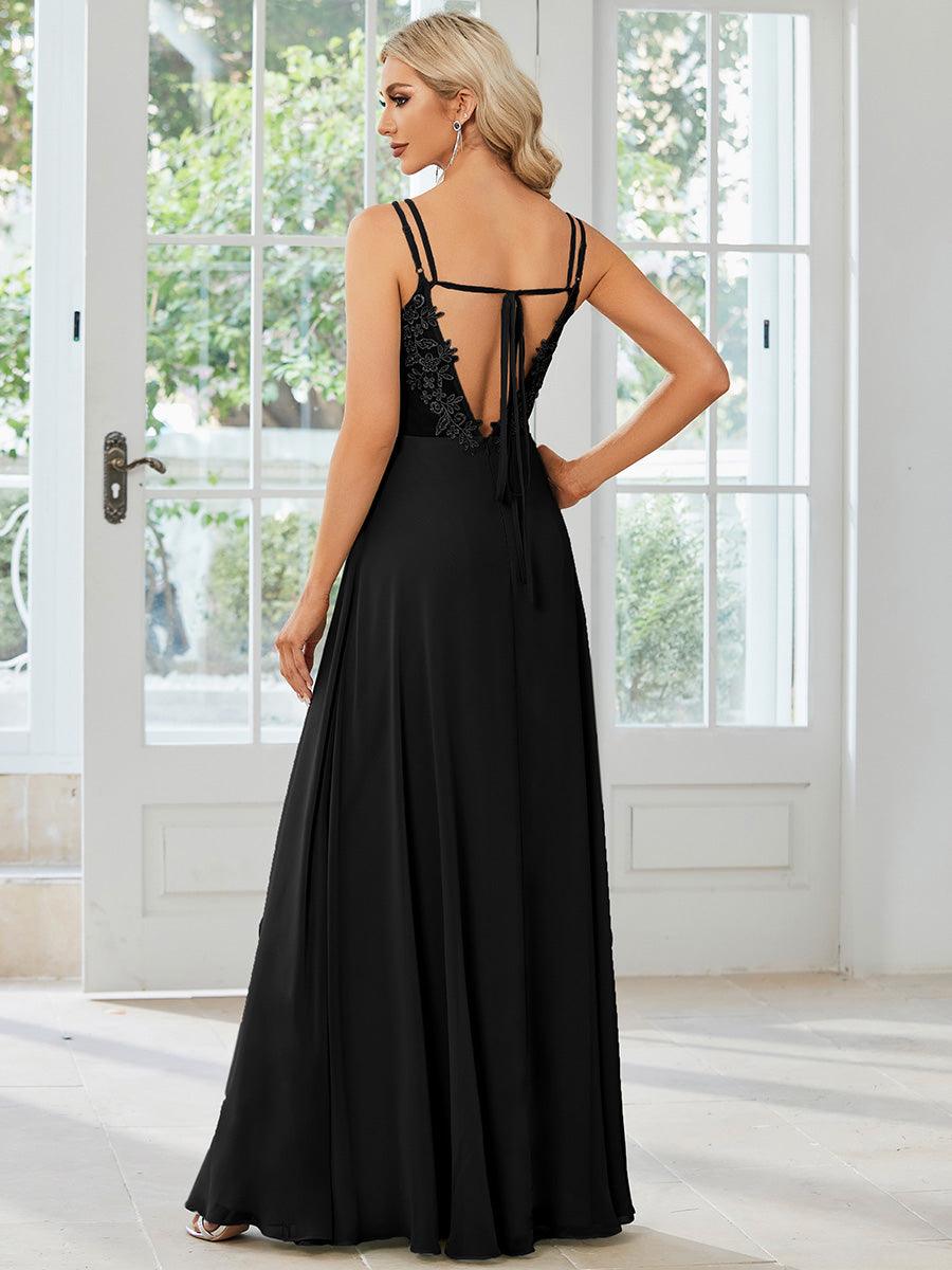 Robe demoiselle d'honneur mousseline et dentelle dos nu bretelles fines #Couleur_Noir