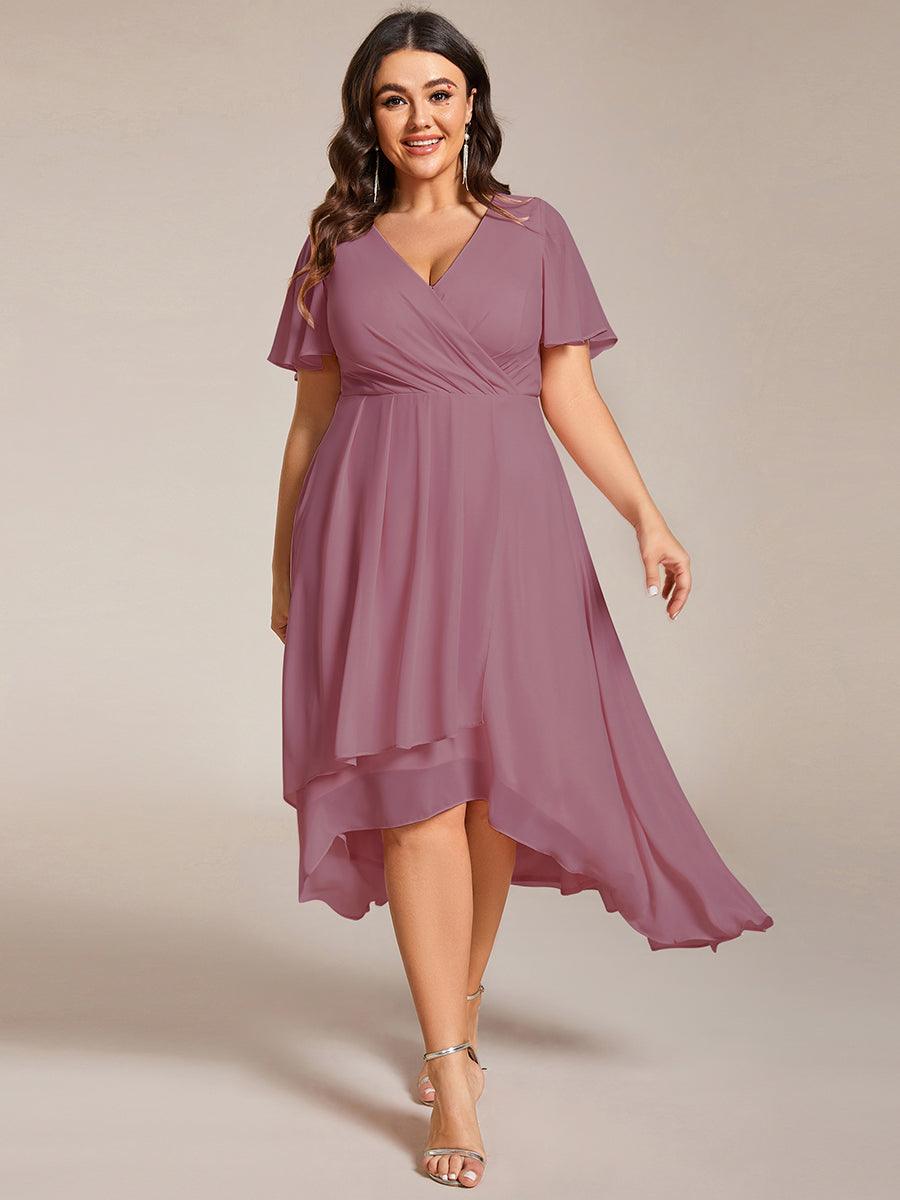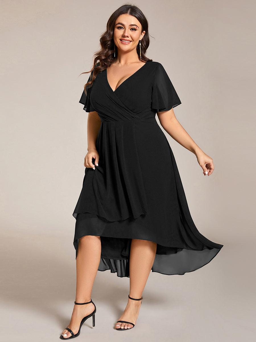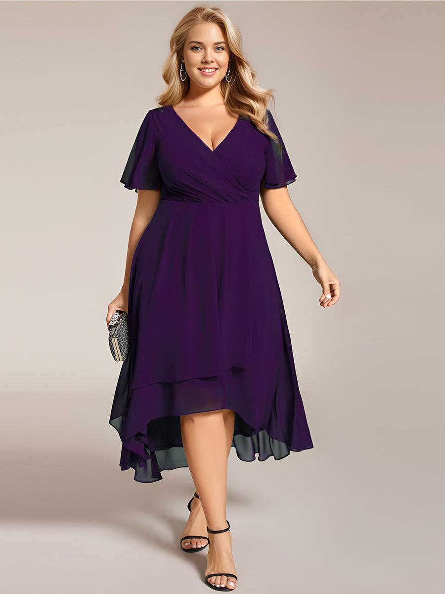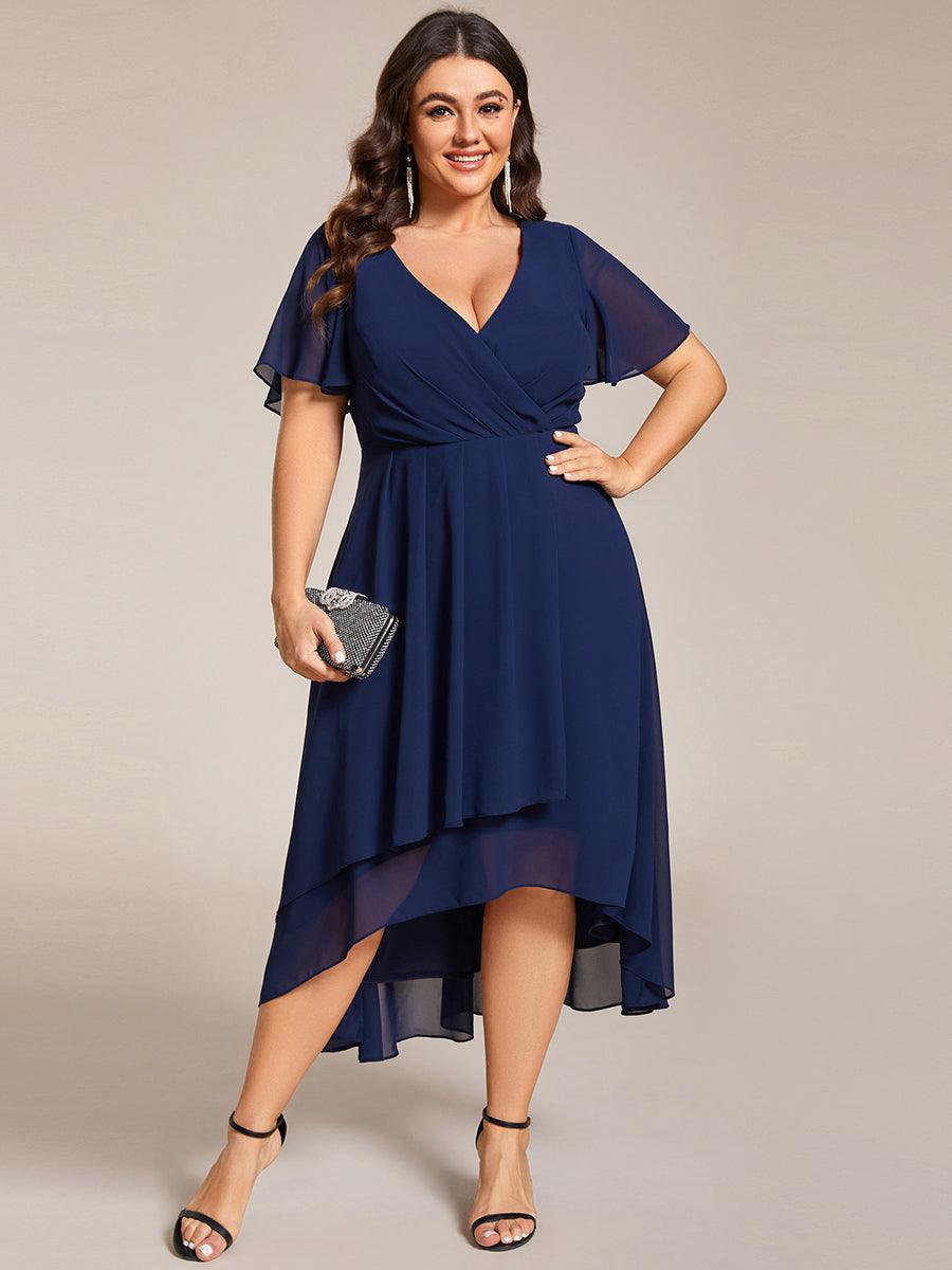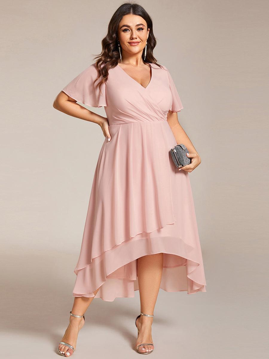 Soyez élégante dans notre robe de mariée mi-longue grande taille en mousseline plissée, à manches courtes et col en V. Conçue pour allier confort et style, sa silhouette trapèze flatteuse et ses détails froncés complètent l'élégant décolleté en V. Les manches courtes ajoutent une touche de sophistication à cette robe midi, parfaite pour les invitées rondes en quête d'un glamour intemporel.