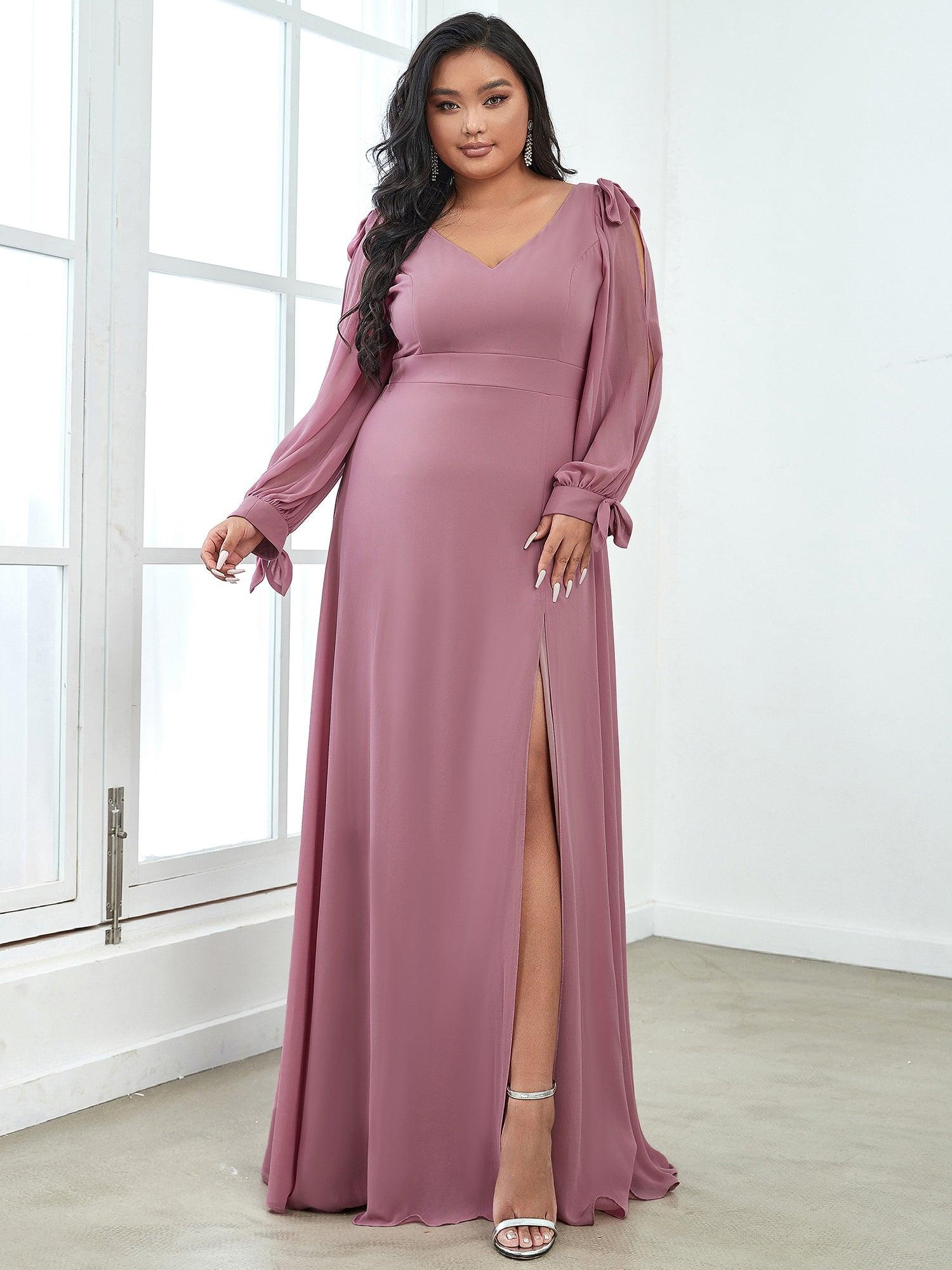 Cette robe de demoiselle d'honneur à la fois minimaliste et élégante est rehaussée de manches longues fendues, d'un décolleté en V, de nœuds sur les épaules et les poignets. Elle est suivie d'une jupe longue avec une fente à hauteur de cuisse.