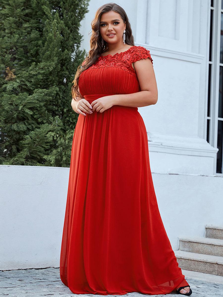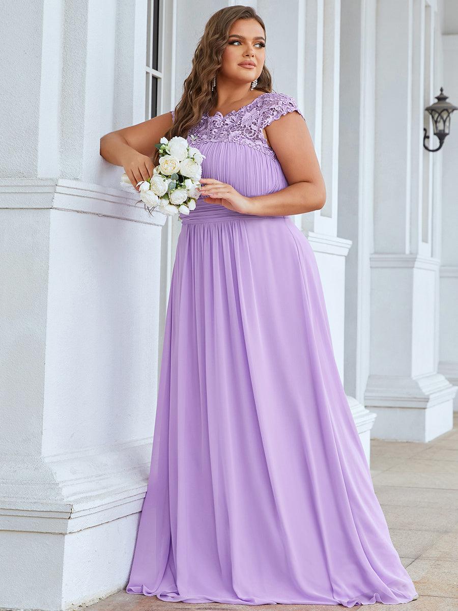 élégante robe de demoiselle d'honneur en mousseline de soie pour femme, avec manches chasubles en dentelle. De la dentelle délicate et des strass décorent l'encolure tandis que les ruchés au niveau du buste et de la taille créent une silhouette flatteuse. Cette élégante robe maxi en mousseline de soie pour demoiselles d'honneur est parfaite pour les mariages.