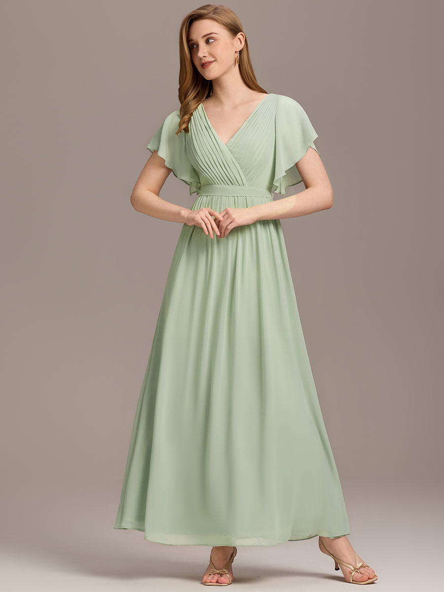 Cette robe demoiselle d'honneur sophistiquée présente des couches fluides de mousseline plissée et une taille nouée flatteuse. Des manches flottantes, un décolleté en V plongeant et une silhouette trapèze dégagent une élégance intemporelle digne de chaque photo.