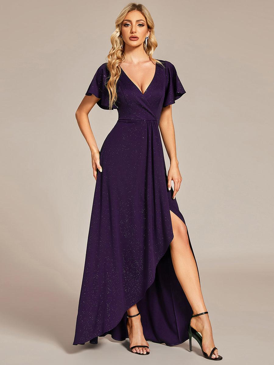 Faites sensation avec cette robe de soirée scintillante à col en V, dotée d'une fente sur le devant et de volants pour une touche d'élégance. L'ourlet haut-bas ajoute une touche moderne, tandis que le tissu scintillant vous fera briller et vous démarquer dans la foule. Parfaite pour un gala ou une occasion spéciale.