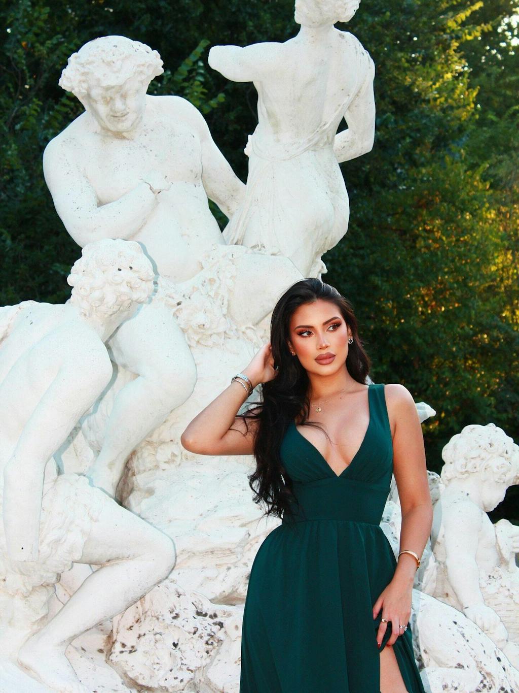 Honorez votre style unique avec cette magnifique robe de soirée sans manches à col en V. Une large taille cintrée et des plis cèdent la place à une silhouette fluide jusqu'au sol, offrant l'équilibre parfait entre sophistication classique et capacité de port intemporelle, juste ce qu'il faut pour votre prochain moment spécial.
