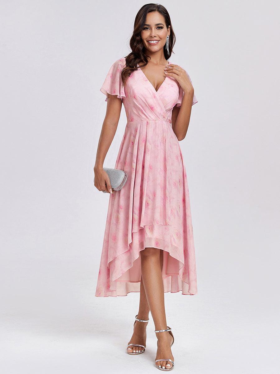 Robe D'invité De Mariage En Mousseline De Soie Mi-Longue Plissée à Manches à Volants Et Col En V #Couleur_Rose