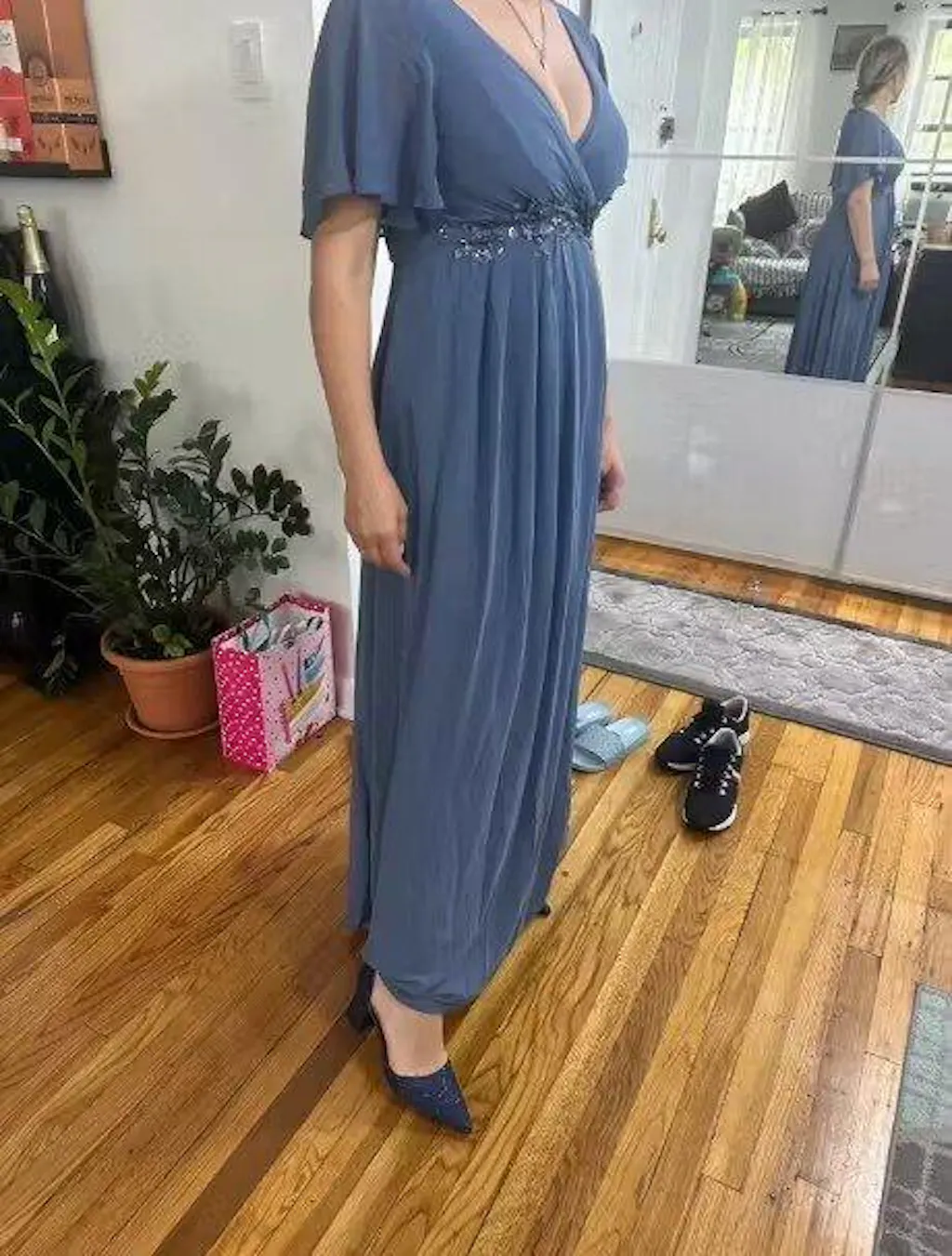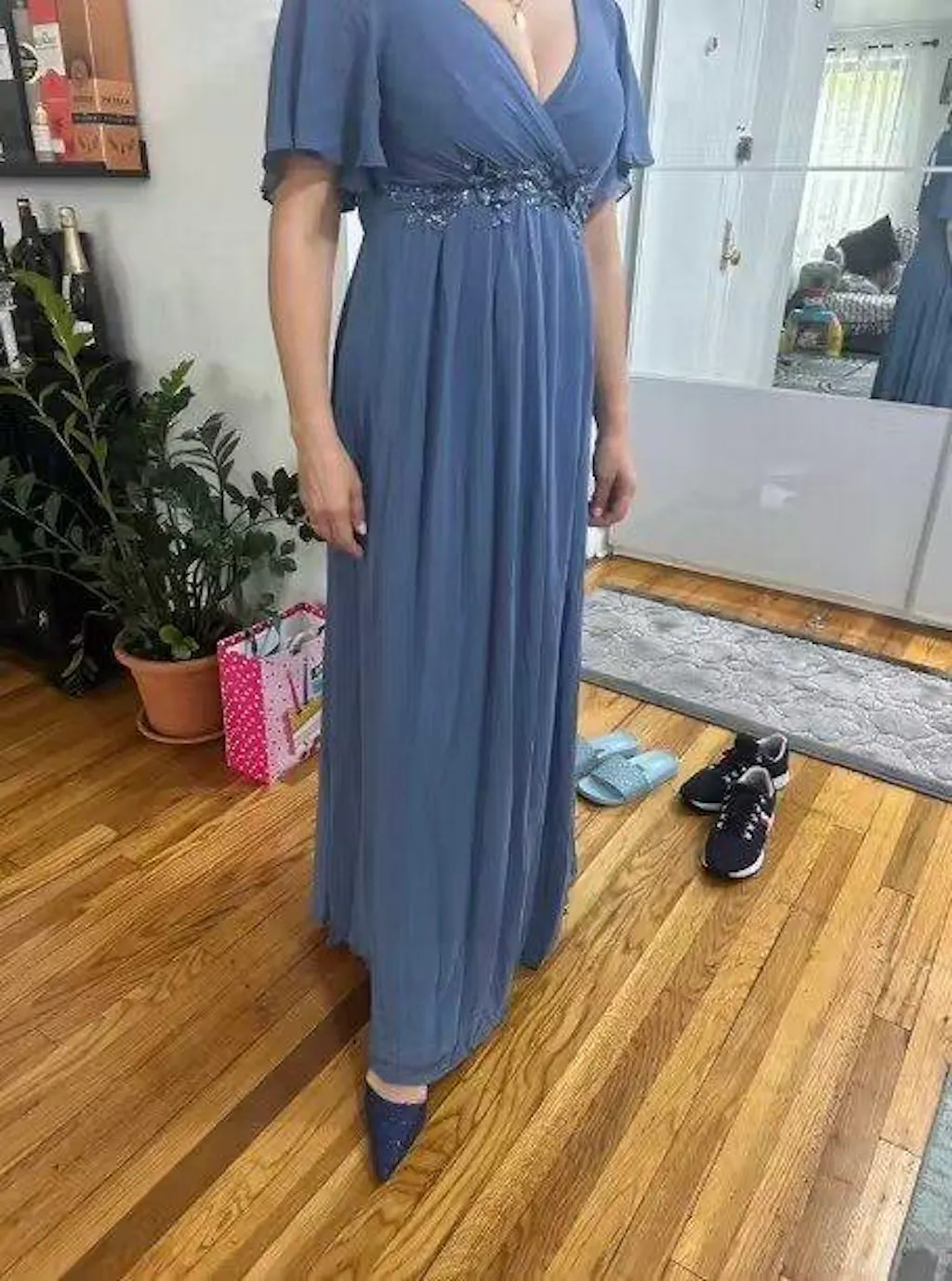 Rehaussez votre tenue d'invité de mariage avec cette robe élégante qui respire le charme et la sophistication. Le décolleté en V accentue le décolleté, tandis que de délicates appliques florales ornent la taille, ajoutant une touche de romantisme et de féminité. Confectionnée à partir d'un tissu en mousseline aérée, la robe se drape gracieusement, créant une silhouette à la fois flatteuse et éthérée. Le détail fantaisiste des volants ajoute une touche ludique mais raffinée, faisant de cette robe un choix parfait pour toute célébration de mariage.
