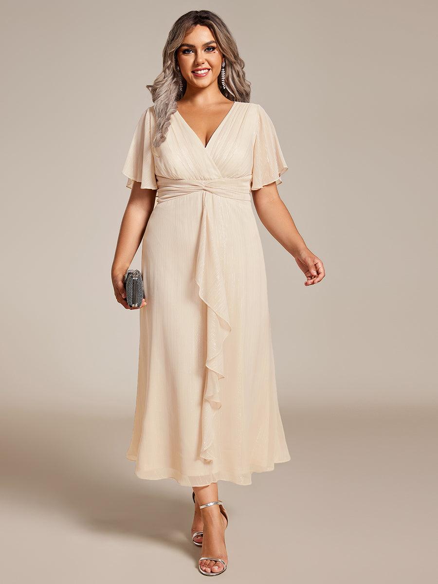 Adoptez une beauté intemporelle avec cette robe trapèze à col en V, parfaite pour toute célébration de mariage. Les manches courtes délicates et l'ourlet à volants créent une silhouette romantique, tandis que le tissu froissé argenté ajoute une touche de glamour. Associez-le à vos accessoires préférés pour un look raffiné et sophistiqué qui vous laissera confiant et radieux toute la journée.